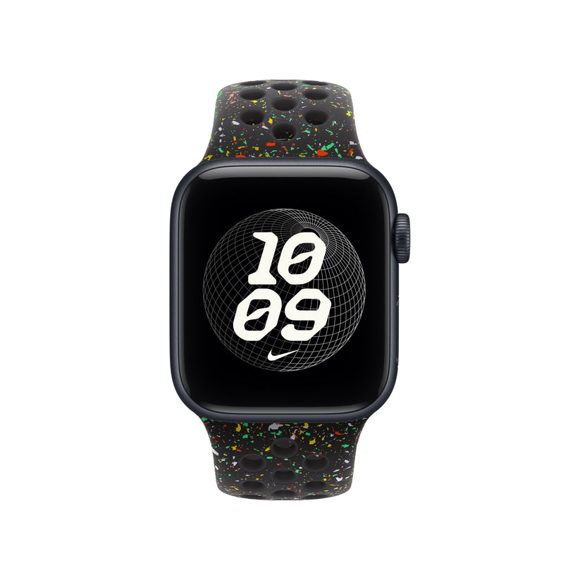 Made with compression-moulded perforations for breathability, the Nike Sport Band is durable and strong, yet surprisingly soft. It features colourful flakes that create a randomised pattern, making each strap completely unique. The smooth, dense material drapes elegantly across your wrist and feels comfortable next to your skin. A new aluminium pin-and-tuck closure gives the pin a fresh matt finish. This strap contains at least 32% recycled fluoroelastomer, with each flake containing at least 66% recycled fluoroelastomer.