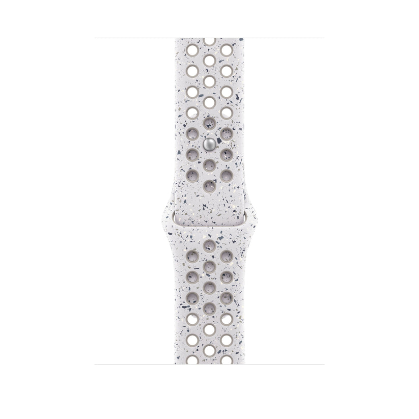 Made with compression-moulded perforations for breathability, the Nike Sport Band is durable and strong, yet surprisingly soft. It features colourful flakes that create a randomised pattern, making each strap completely unique. The smooth, dense material drapes elegantly across your wrist and feels comfortable next to your skin. A new aluminium pin-and-tuck closure gives the pin a fresh matt finish. This strap contains at least 32% recycled fluoroelastomer, with each flake containing at least 66% recycled fluoroelastomer.