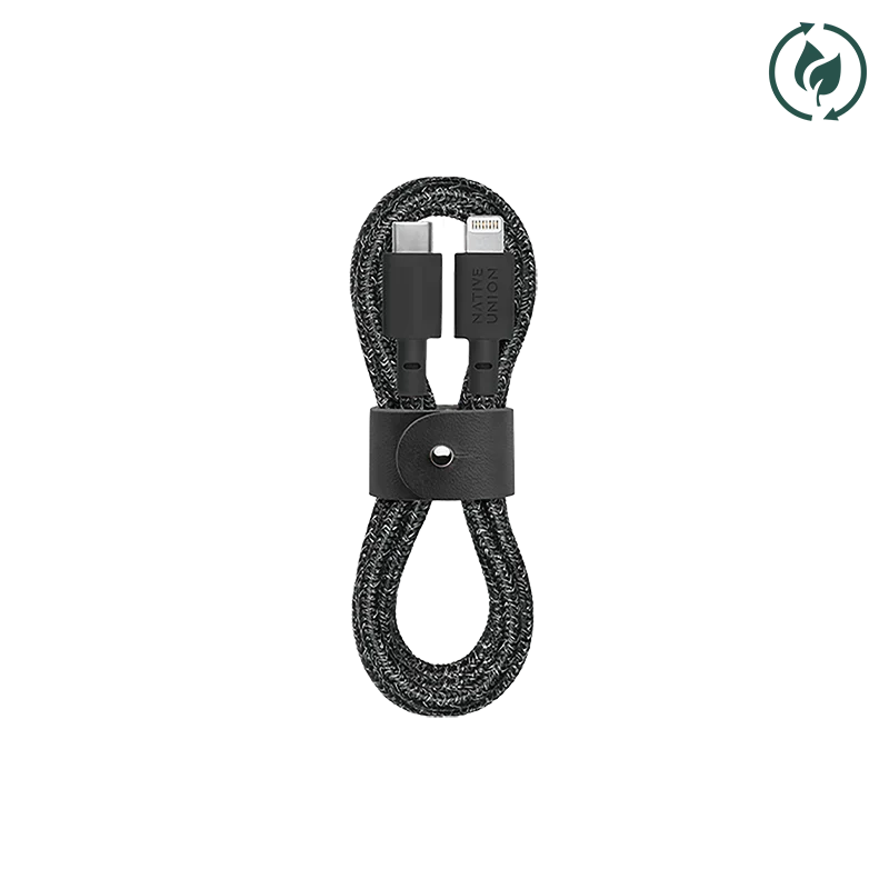 - Optimized for iPhones, iPads, and AirPods, this eco-friendly charging cable is designed with innovation: featuring 100% recycled PET braiding, a housing made from 100% recycled TPU, and a strap crafted from 75% recycled bonded leather.