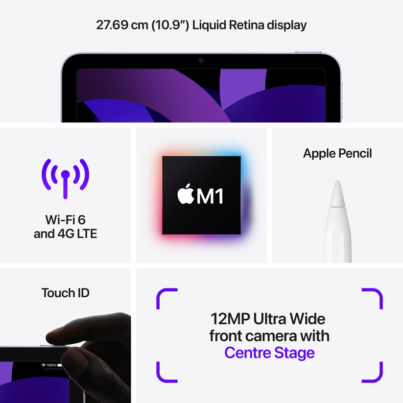 iPad Air. With an immersive 10.9-inch Liquid Retina display. The breakthrough Apple M1 chip delivers faster performance, making iPad Air a creative and mobile gaming powerhouse. Featuring Touch ID, advanced cameras, USB-C, Wi-Fi 6, capability for blazing-fast 5G, and support for Magic Keyboard and Apple Pencil (2nd generation).