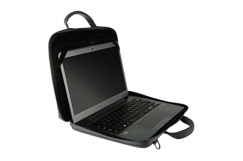 Slim and overprotective bag, made of fabric made from recycled plastic, equipped with a semi-rigid back side. The comfortable internal compartment, reachable through the opening of the zip on the three sides of the bag, allows you to work with your device by fixing the ends with two angular elastic bands. Supplied padded and removable shoulder strap.
