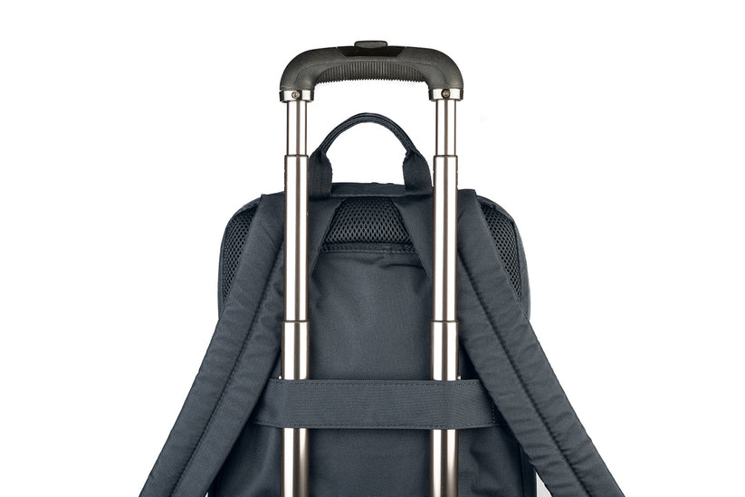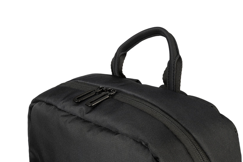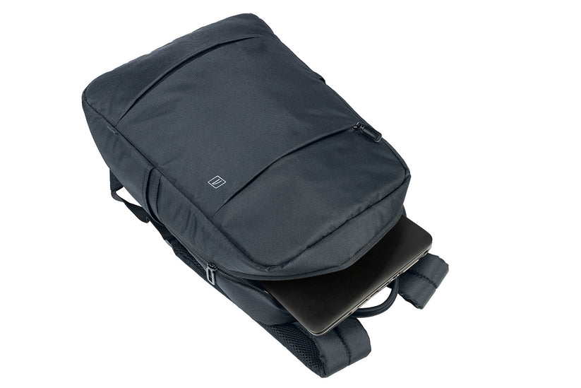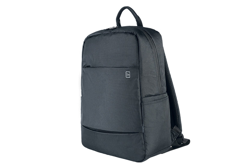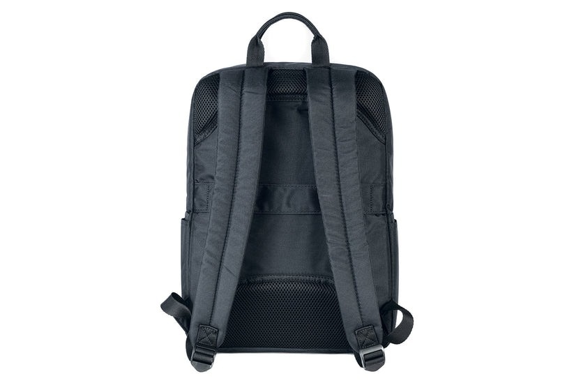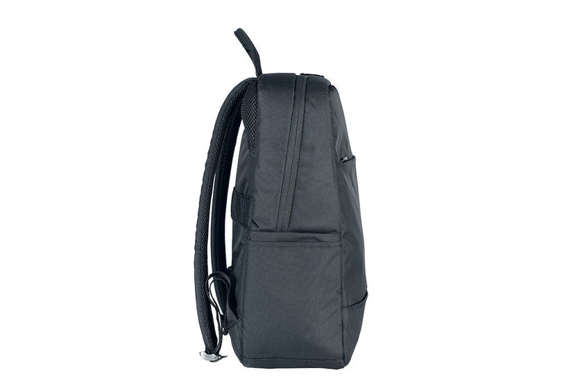 Lightweight backpack in fabric made from recycled plastic featuring a modern, compact design.. The adjustable, padded shoulder straps together with the ergonomic back and flat, external, organizer pocket on the front, make it convenient and useful for both work and leisure.