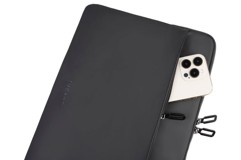 Waterproof sleeve in rubberized material designed for 15/16" devices r. Featuring a single padded compartment with non-slip corner flaps, it aslo has the Gommo laptop cover has a handy external pocket for accessories. |