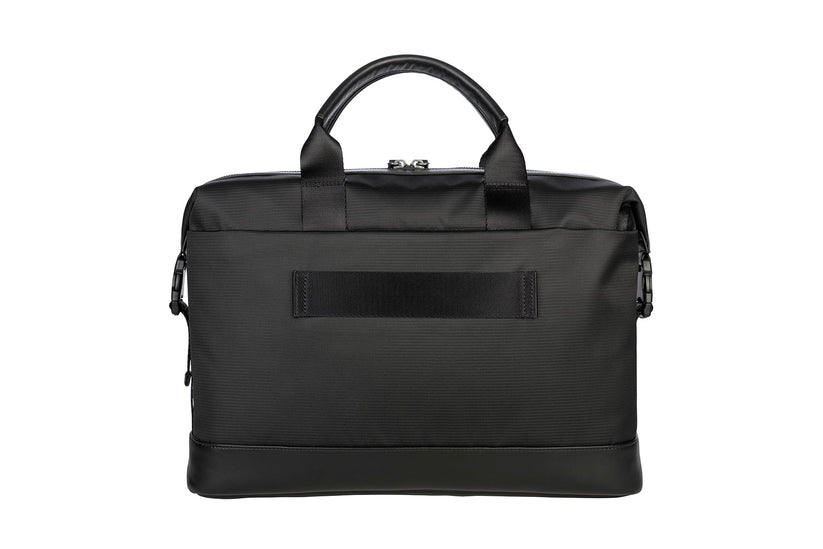 Business bag made of fabric produced from recycled plastic features leather accents and an internal compartment with a double protective pocket for 15.6" laptops or 16" MacBooks.