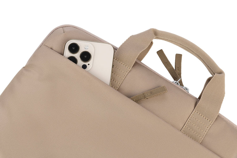Super-slim bag for laptops up to 15.6" made of high-tech material with contrast-color details. Double handles and detachable shoulder strap made with webbing